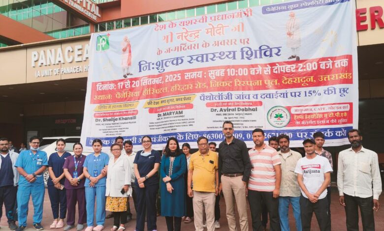देहरादून। पैनेसिया सुपर स्पेशलिटी हॉस्पिटल द्वारा प्रधानमंत्री नरेंद्र मोदी के जन्मदिवस के उपलक्ष्य में “मानवता की सेवा के पथ पर” विशेष निःशुल्क स्वास्थ्य शिविर का आयोजन किया गया। यह शिविर अस्पताल परिसर में दिनांक 17 से 20 सितम्बर तक आयोजित किया जा है। शिविर में पहले दिन कुल 246  रोगियों ने परामर्श एवं उपचार प्राप्त किया। शिविर में विशेषज्ञ चिकित्सकों की टीम ने लोगों को परामर्श और उपचार प्रदान किया। इसमें फिजिशियन एवं सामान्य रोग विशेषज्ञ डॉ. शैलजा खांसिली, प्रसूति एवं स्त्री रोग विशेषज्ञ डॉ. मरियम, हड्डी एवं जोड़ रोग विशेषज्ञ  डॉ. अविरल डोभाल ने अपनी सेवाएं दीं। शिविर में निःशुल्क ब्लड शुगर और ब्लड प्रेशर टेस्ट किए गए साथ ही पैथोलॉजी जांच एवं दवाइयों पर 15 प्रतिशत की विशेष छूट भी उपलब्ध कराई गई।