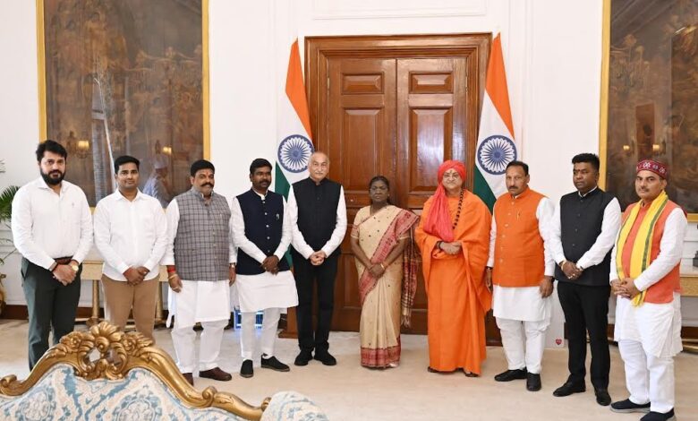 हरिद्वार। श्रीदशनाम पंचायती जूना अखाड़े के महामंडलेश्वर डॉ. स्वामी उमाकांतानन्द सरस्वती जी महाराज संस्थापक अध्यक्ष श्रीराम डिवाईन चैरिटेबल ट्रस्ट हरिद्वार एवं शाश्वतम् फाउंडेशन मारीशस के पावन सानिध्य में शाश्वतम् परिवार के प्रतिनिधियों ने भारत की महामहिम राष्ट्रपति द्रोपदी मुर्मू से राष्ट्रीय मुद्दों को लेकर शुक्रवार को शिष्टाचार भेंट की। डेलीगेशन में भारतीय जनता पार्टी के पूर्व राज्यसभा सांसद एवं एस सी/एस टी मोर्चा के राष्ट्रीय अध्यक्ष मा समीर उरांव, वरिष्ठ भाजपा नेता राकेश भास्कर झारखंड, हरिद्वार शाश्वतम् परिवार के राष्ट्रीय संयोजक डॉ जितेन्द्र सिंह एवं वरिष्ठ आयुर्वेदिक वैद्य दीपक कुमार तथा अन्य प्रतिनिधि भी उपस्थित रहे।