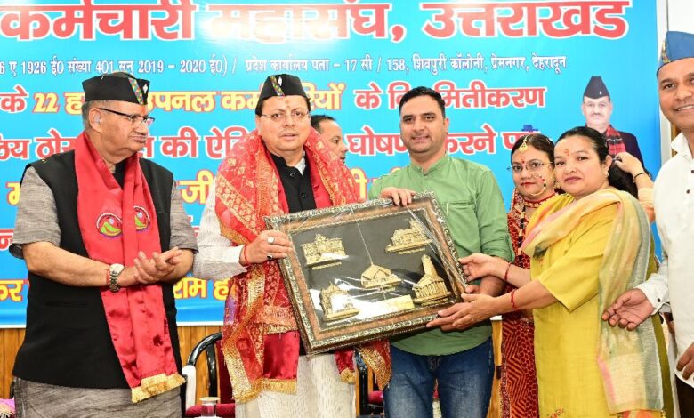 देहरादून। मुख्यमंत्री पुष्कर सिंह धामी ने शनिवार को मुख्य सेवक सदन, देहरादून में उपनल कर्मचारी महासंघ द्वारा आयोजित धन्यवाद व अभिनन्दन समारोह में प्रतिभाग किया। इस अवसर पर उपनल कर्मचारी महासंघ ने उपनल कर्मियों के नियमितीकरण के लिए ठोस नीति बनाए जाने की घोषणा किए जाने पर मुख्यमंत्री का आभार व्यक्त किया। मुख्यमंत्री पुष्कर सिंह धामी ने उनका अभिनंदन किए जाने पर सभी उपनल कर्मचारियों को धन्यवाद अर्पित करते हुए कहा कि इस अभिनंदन की हकदार प्रदेश की सवा करोड़ जनता भी है, जिन्होनें उन्हें प्रदेश की सेवा करने का अवसर दिया है। उन्होंने कहा राज्य सरकार एक ठोस और प्रभावी नीति बनाकर जल्द ही उपनल के कर्मचारियों को नियमित करने का कार्य प्रारंभ करेगी। जिसे चरणबद्ध तरीके से तय समय सीमा के अंदर किया जाएगा। उन्होंने कहा इस नियमितीकरण प्रक्रिया से उपनल कर्मचारियों की आर्थिक स्थिति में सुधार होगा एवं उनके भीतर आत्मसम्मान की भावना और भी अधिक प्रगाढ़ होगी।